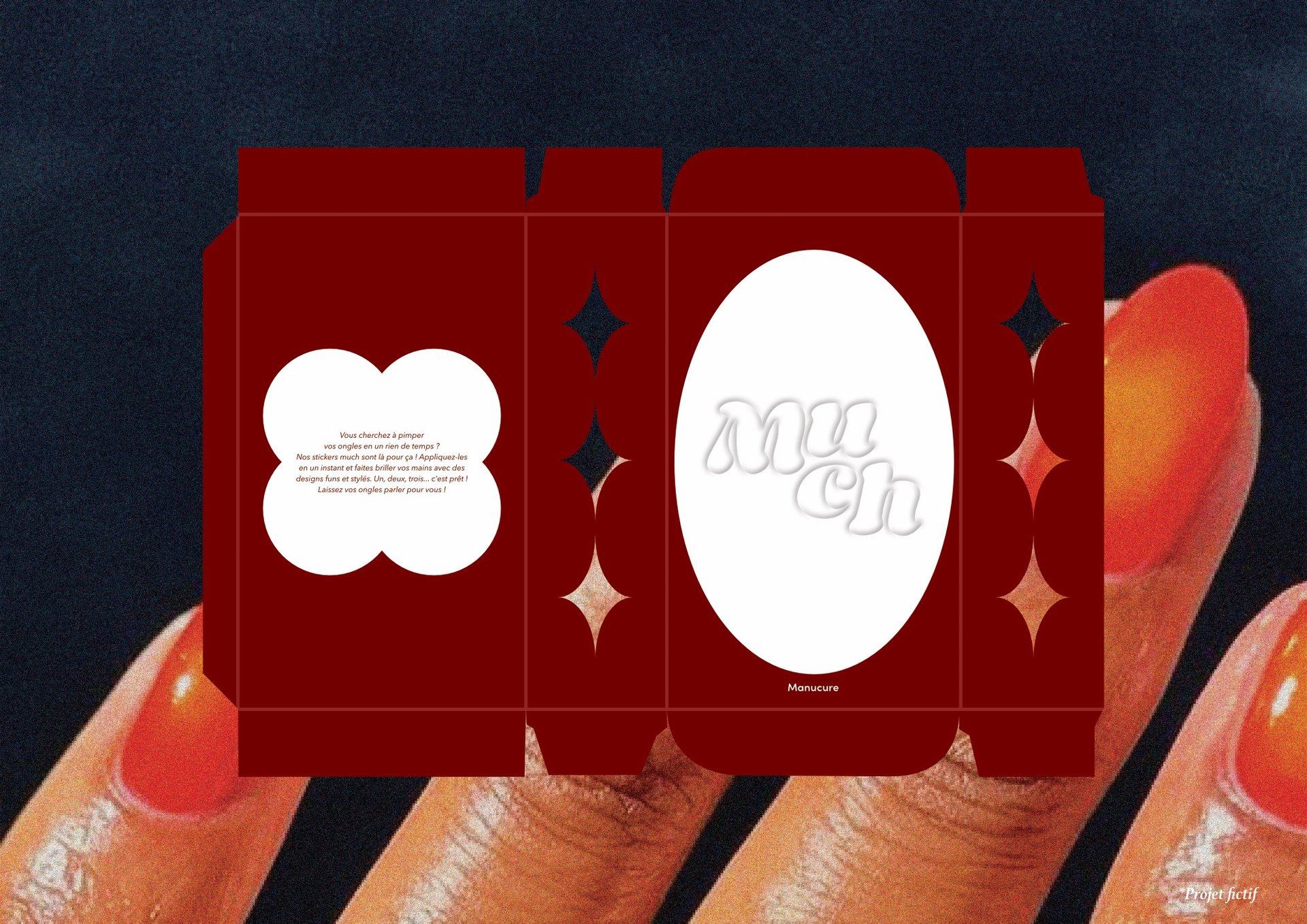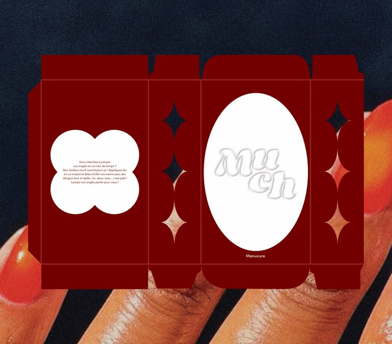 Imaginé avec un gaufrage, donnant l'impression d'un sticker prêt à être décollé directement depuis le packaging. L'ovale, lui, évoque subtilement la forme d'un ongle. Les étoiles se trouvant sur le côté du packaging laissent subtilement entrevoir les stickers, tandis que la contre-forme au dos permet d'en savoir un peu plus sur le produit !